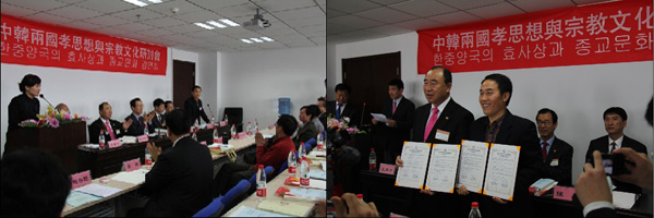 2011年4月13日,"中韓兩國孝思想與宗教文化學(xué)術(shù)研討會(huì)暨兩國學(xué)術(shù)機(jī)構(gòu)、團(tuán)體交流協(xié)議簽約儀式"在山東大學(xué)儒學(xué)高等研究院舉行。本次研討會(huì)由山東大學(xué)儒學(xué)高等研究院、韓國圣山孝道大學(xué)院、濟(jì)南市傳統(tǒng)文化研究會(huì)、韓國大田廣域市孝指導(dǎo)士協(xié)會(huì)等單位主辦,山東省老齡委孝文化專業(yè)委員會(huì)、韓國大田廣域市、韓國孝運(yùn)動(dòng)中央總會(huì)、韓國大田廣域市孝實(shí)踐運(yùn)動(dòng)本部聯(lián)合承辦。會(huì)議由山東大學(xué)儒學(xué)高等研究院副院長顏炳罡教授主持,來自中、韓兩國的專家學(xué)者逾80人參加了此次研討會(huì)。