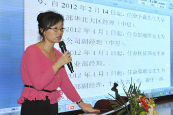 接下來(lái),人力資源部經(jīng)理于鳳仙女士上臺(tái)宣讀了《2012年機(jī)構(gòu)調(diào)整及人事任免決定》。隨后,湯經(jīng)理上臺(tái)為新任命的12名管理人員頒發(fā)了任命書(shū)。接過(guò)紅燦燦的任命書(shū),同時(shí)也接過(guò)一份沉甸甸的責(zé)任,大家紛紛表示:一定不辜負(fù)公司領(lǐng)導(dǎo)的重托與信任,在新的崗位一定會(huì)再接再厲,繼續(xù)努力,為公司發(fā)展做出更大的貢獻(xiàn)!