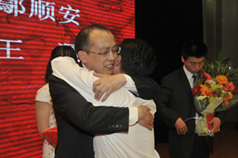 湯經(jīng)理與忠誠(chéng)敬業(yè)貢獻(xiàn)獎(jiǎng)獲獎(jiǎng)人員熱情擁抱 湯經(jīng)理與忠誠(chéng)敬業(yè)貢獻(xiàn)獎(jiǎng)人員合影