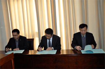 簽訂監(jiān)管承諾書 杜經(jīng)理與其他兩位公司代表上臺領(lǐng)取獎牌