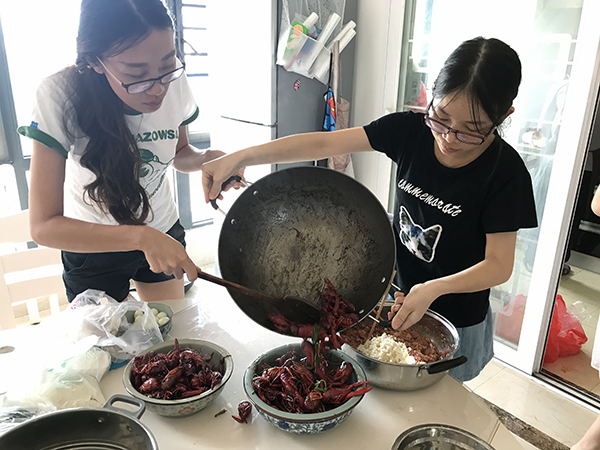 大廚們陸續到場,不一會廚房內就已經熱火朝天,洗菜、切菜,忙得不亦樂乎。很快的,第一道熱菜就下鍋了,第一道熱菜是小云做的十三香小龍蝦,只見她用刷子 把小龍蝦仔仔細細刷了一遍,最激動人心的就是下鍋的那一刻了,爆香蔥姜后再把小龍蝦倒進鍋里,頓時發出“呲啦”的聲音,快速翻炒小龍蝦,沒過多久就陣陣飄 香,小龍蝦的香味讓同事們的饞蟲都被勾出來了。