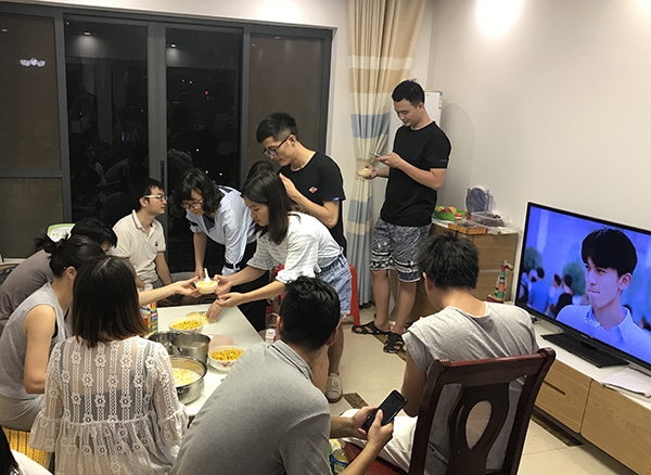 相較于廚房內的熱火朝天,客廳里卻是另一番景象。大家就像是在自己家里一樣,放松地坐在沙發上聊天、看電視、吃水果,還有的同事湊成桌打麻將,偶爾聽廚房 里大廚們的“差遣”打打下手。相比于工作時間內的合作,這個時候的大家更像是一家人,相處更放松、更愜意。多了工作以外的接觸和了解,相信大家以后在工作 中溝通更加順利、合作更加親密無間。