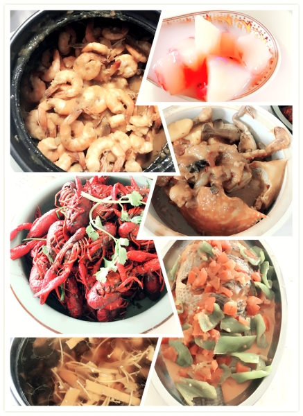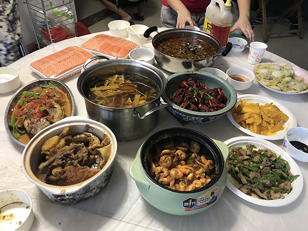 沒想到平時工作能力杠杠的同事們,做起菜來也絲毫不遜色。沒過多久菜已經陸續上桌,有毛毛做的紅燒魚與水煮牛肉,米粒做的菜包釀、咸蛋炒南瓜;陶大神做的 佛跳墻、蟹黃煲、椰香蝦;潤姐的燒鴨、西芹紅椒炒白果、涼拌木耳;寧寧的炒花甲螺;振宇做的青椒炒肉;芳芳的芒果西米露。一大桌菜色香味俱全、品種多樣, 飯前涼菜、家常炒菜、營養豐盛的大菜以及飯后甜點應有盡有。