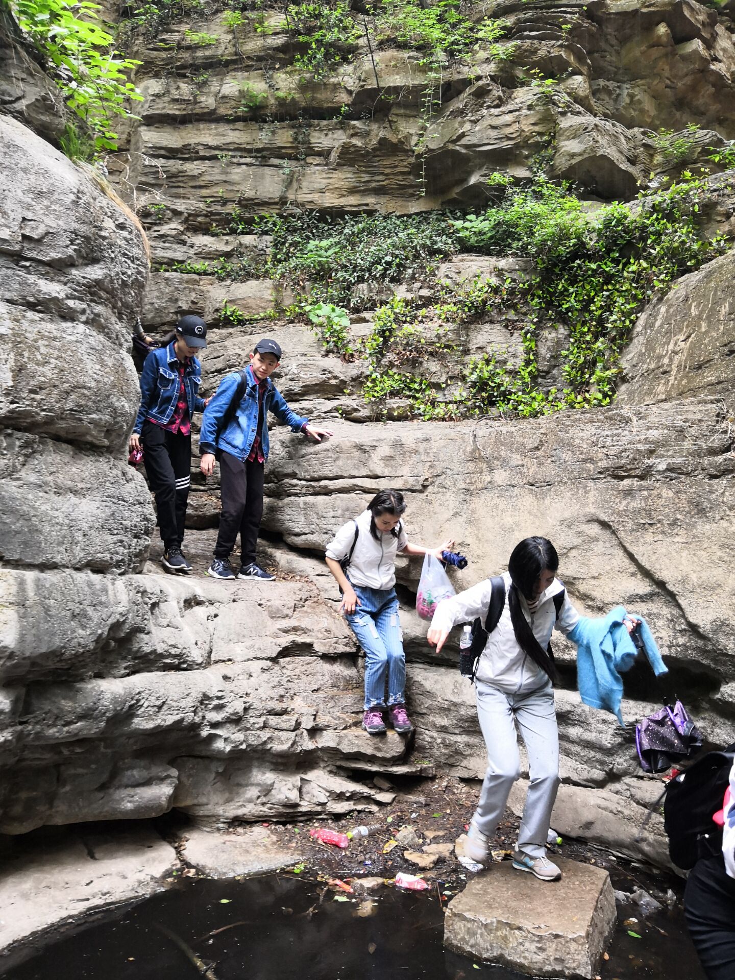大家一路說說笑笑,很快就到了藏龍澗。藏龍澗地勢較低,長數公里,開闊處寬數丈,緊窄處伸兩臂幾可摸到兩側峭壁,兩側如刀劈斧削,最高處逾百米。因特殊的地理結構,山谷里的風聲低沉如龍呤而得名。我們到達藏龍澗時正好下起了淅淅瀝瀝的小雨,伴著小雨徒步,別有一番滋味。不過這也給我們的行程增加了難度,因為此處巖石較多,經過雨水的沖刷變得十分光滑,再加上道路都是未經修葺的,所以很多地方行進的比較艱難。大家互相攙扶小心翼翼地行走,還有眾多熱心驢友的幫助,最終順利走過了最難的一段路。雖然過程中特別緊張害怕,但大家依舊興致不減,看看我們走過的路,心底滿是征服險峻,突破自我的自豪感和成就感,也為我們的徒步之旅增色不少。