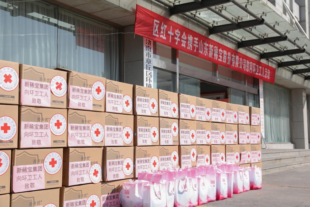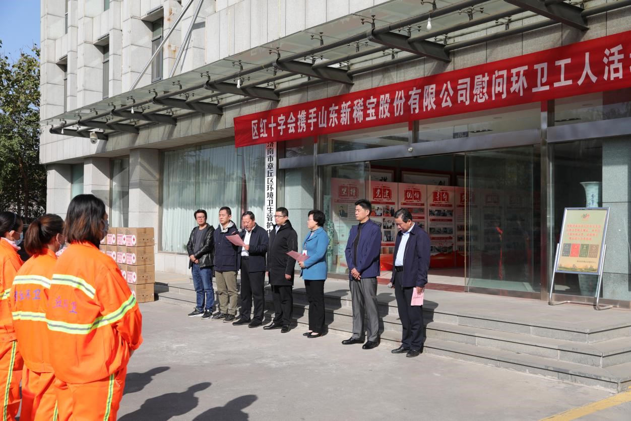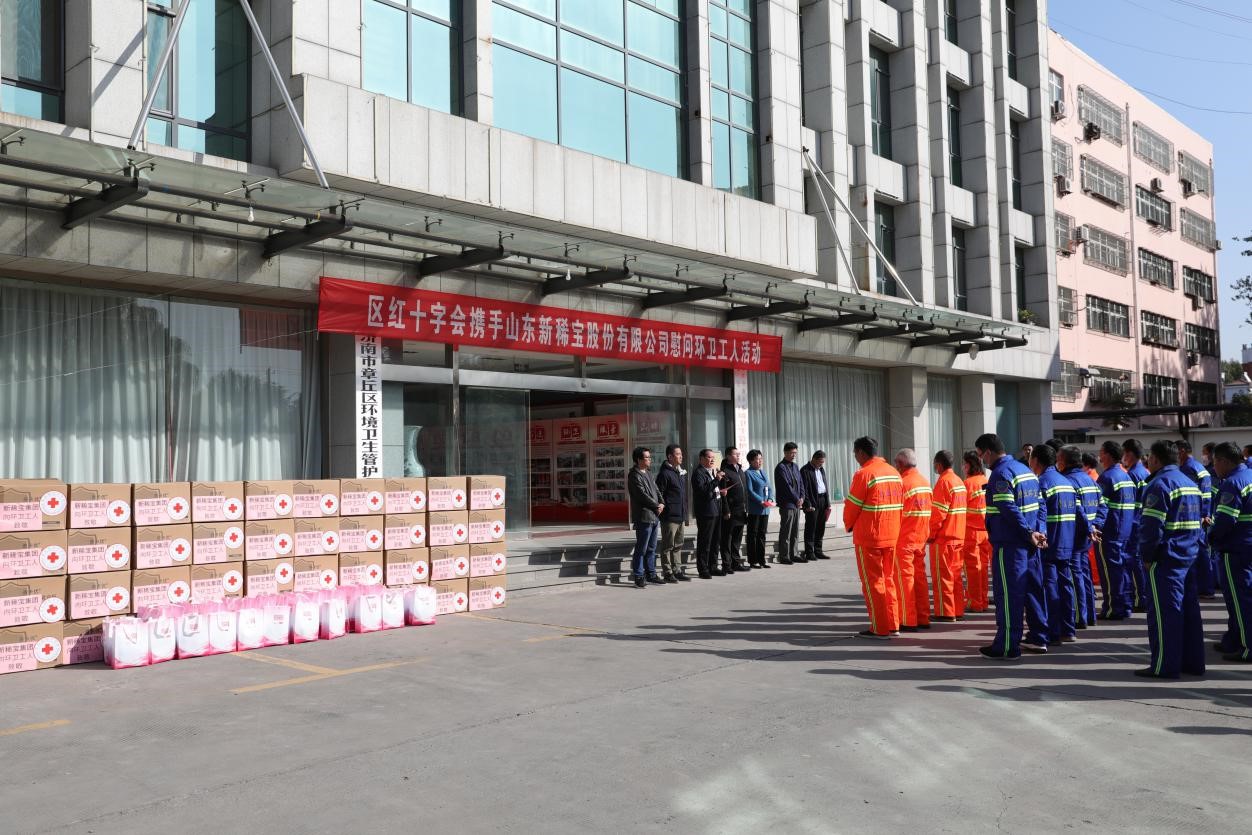 2020年11月3日,新稀寶集團攜手章丘區紅十字會為章丘區環衛工人送去溫暖問候。捐贈善卡優乳清乳鐵蛋白固體飲料共1200罐,總價值432000元。